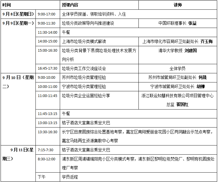 在此背景下,中國(guó)環(huán)聯(lián)擬于2019年9月8日至11日在上海市舉辦第一期垃圾分類培訓(xùn),培訓(xùn)內(nèi)容包括垃圾分類政策導(dǎo)向與推進(jìn)建設(shè)、垃圾分類實(shí)施方案與實(shí)務(wù)操作、上海等相關(guān)城市垃圾分類模式分析與經(jīng)驗(yàn)分享等,并組織實(shí)地參觀考察。