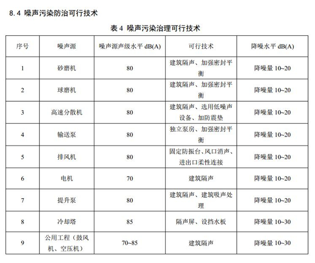 4.2.2.4 油墨工業(yè)企業(yè)產(chǎn)生的噪聲主要來自于生產(chǎn)過程中使用的生產(chǎn)設(shè)備(如砂磨機(jī)、球磨機(jī)、高速分散機(jī)、輸送泵等)和輔助生產(chǎn)設(shè)備(如排風(fēng)機(jī)、電機(jī)、提升泵、冷卻塔、鼓風(fēng)機(jī)、空壓機(jī)等)運(yùn)行時產(chǎn)生的噪聲。