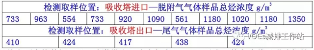 【吸收塔尾氣濃度較高】中石化環(huán)境監(jiān)測總站、中石化撫順石油研究院對華北地區(qū)采用貧油作為吸收劑噴淋的一套吸附法油氣回收裝置,進行了吸收塔進出口油氣濃度采樣檢測分析,得到如下數(shù)據(jù):