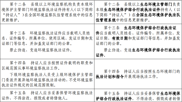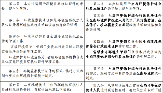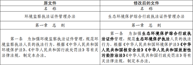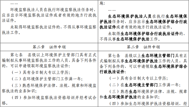 擬將23號(hào)令中“環(huán)境監(jiān)察執(zhí)法證件”修改為“生態(tài)環(huán)境保護(hù)綜合行政執(zhí)法證件”,將條文中“環(huán)境保護(hù)”修改為“生態(tài)環(huán)境”,其他條款同步作相應(yīng)修改。