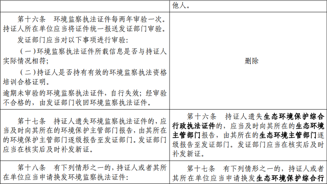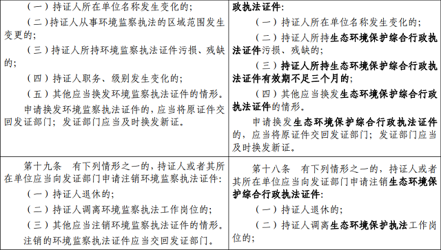 第十七條 有下列情形之一的,持證人或者其所在單位應(yīng)當(dāng)申請(qǐng)換發(fā)生態(tài)環(huán)境保護(hù)綜合行政執(zhí)法證件: