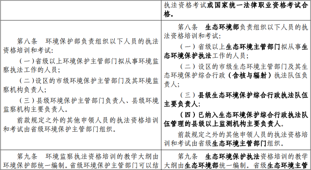 第八條 生態(tài)環(huán)境部負(fù)責(zé)組織以下人員的執(zhí)法資格培訓(xùn)和考試: