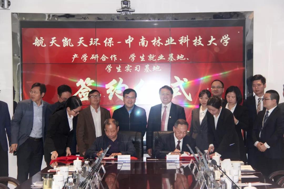 2019年11月6日,航天凱天環(huán)??萍脊煞萦邢薰九c中南林業(yè)科技大學(xué)在航天凱天工業(yè)園內(nèi)成功簽訂產(chǎn)學(xué)研合作協(xié)議,學(xué)生就業(yè)、實習(xí)基地協(xié)議。中南林業(yè)科技大學(xué)黨委書記王漢青、環(huán)境科學(xué)與工程學(xué)院院長王平、科技處副處長付紅軍等,航天凱天環(huán)??偛萌~明強(qiáng)、副總裁曾毅夫、總裁助理伍蕓昕等出席簽約儀式,總裁助理葉明強(qiáng)主持會議。