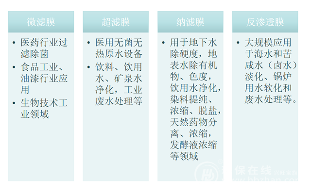 依據(jù)孔徑的不同(或稱為截留分子量的大小)可將膜分為微濾(MF)膜、超濾(UF)膜、納濾(NF)膜和反滲透(RO)膜等。按照不同應(yīng)用領(lǐng)域來看,超微濾膜與反滲透膜更為常見。其中超微濾膜主要應(yīng)用與污水處理和中水回用、給水凈化及海水淡化的水預(yù)處理階段;反滲透膜則可有效脫除溶鹽和部分有機(jī)物,對懸浮物的脫除更徹底,出水水質(zhì)可達(dá)飲用水標(biāo)準(zhǔn),主要應(yīng)用于脫鹽、超純水制造、海水淡化處理。
