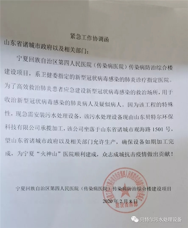 2019年底,臨近春節(jié),當(dāng)全國人民沉浸在節(jié)日的祥和中時,一場突如其來來的疫情蔓延開來,陰云籠罩在神州大地。武漢告急!湖北告急!全國進入一級響應(yīng),各地紛紛伸出援手,一時間,應(yīng)急物資源源不斷的運往武漢。疫情就是命令,作為一家以致力于環(huán)保事業(yè)的企業(yè),山東貝特爾環(huán)??萍加邢薰靖橇x不容辭,全員一心,共克時艱,為緩解疫情肆虐下醫(yī)院污水處理的巨大壓力,積極準(zhǔn)備制作醫(yī)院污水處理設(shè)備。在接到寧夏回族自治區(qū)第四醫(yī)院(傳染病醫(yī)院)的求助信函時,第一時間組織員工,加班加點為寧夏第四醫(yī)院趕制兩套醫(yī)院污水處理設(shè)備,并于2月11日連夜運往寧夏,為寧夏“火神山”醫(yī)院順利建成,眾志成城抗擊疫情做出貢獻!中國加油!