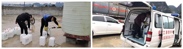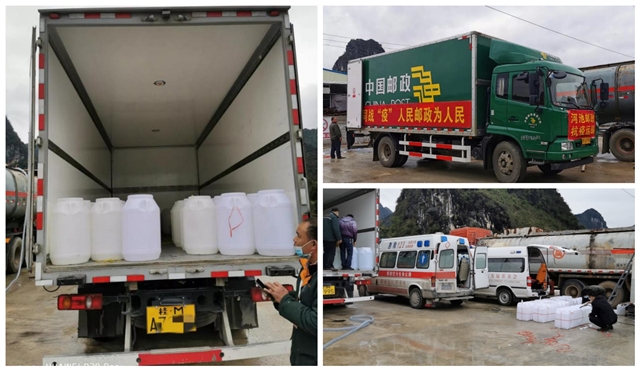 ▲都安基地現(xiàn)場分裝消毒劑給各捐贈單位