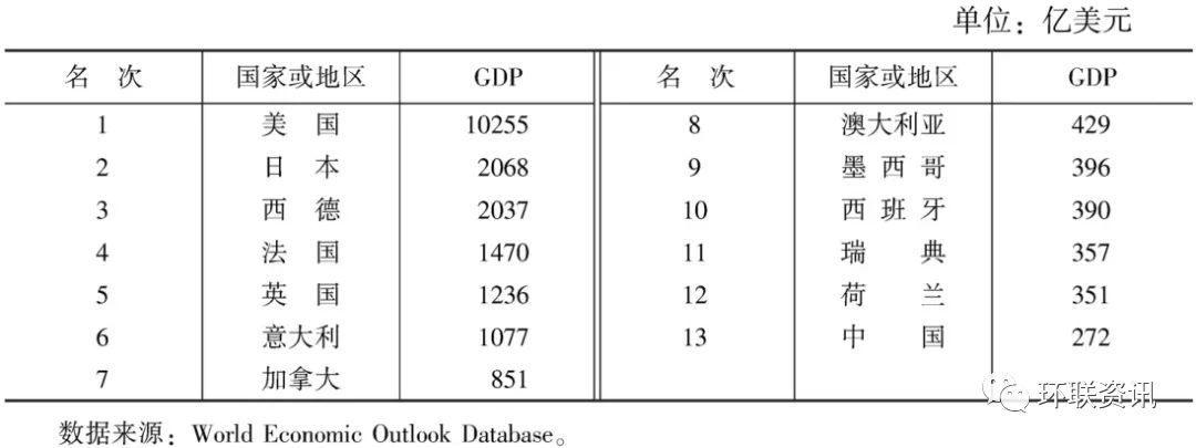 ▲1970年部分國家的GDP數(shù)據(jù)。此時(shí)的日本已經(jīng)成為僅次于美國的第二大經(jīng)濟(jì)體,占到美國GDP的20%有余
