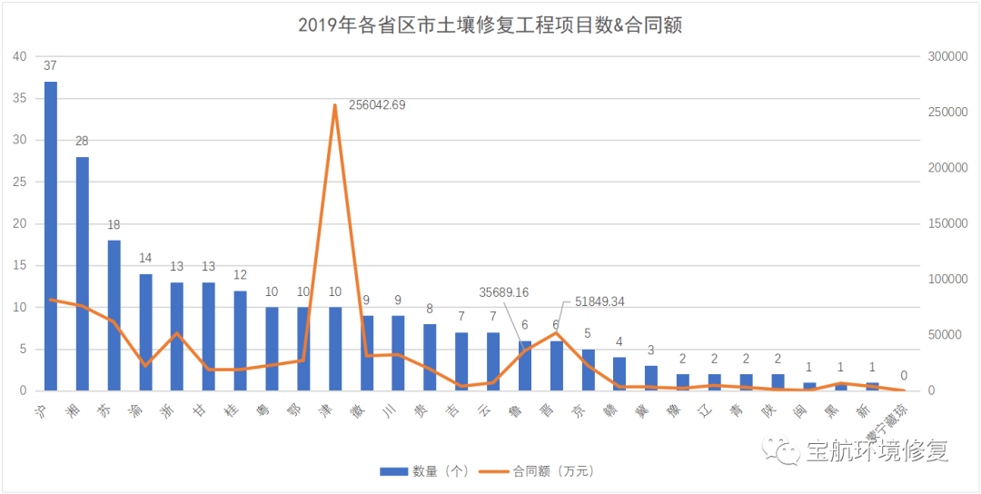 圖2 各省區(qū)市土壤修復(fù)工程項目數(shù)&合同額