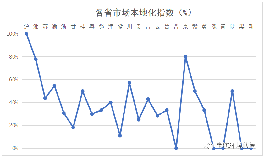 除了污染特征、地方財力等因素外,市場環(huán)境也是我們關(guān)注的重點(diǎn),為此我們提出了一個簡單的“市場本地化指數(shù)”,即省外企業(yè)中標(biāo)項目數(shù)量在該省份全部項目中所占的比例。