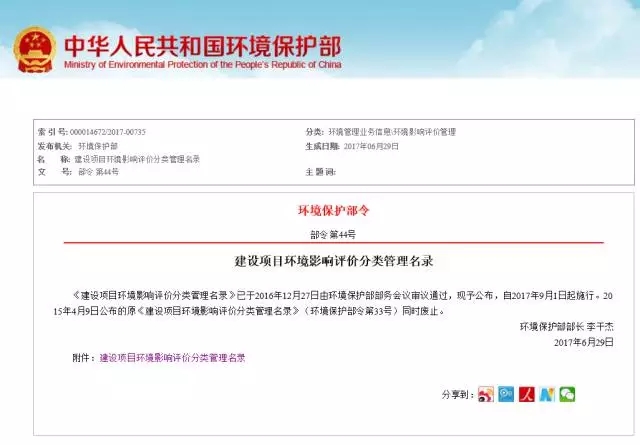 第八條 本名錄自2017年9月1日起施行。2015年4月9日公布的原《建設(shè)項(xiàng)目環(huán)境影響評(píng)價(jià)分類管理名錄》(環(huán)境保護(hù)部令第33號(hào))同時(shí)廢止。
