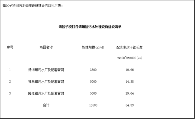 該項(xiàng)目污水處理廠及配套管網(wǎng)工程實(shí)施范圍包括靖海鎮(zhèn)、神泉鎮(zhèn)、隆江鎮(zhèn)等共3個(gè)鎮(zhèn)區(qū)范圍,污水處理工程總服務(wù)人口約9.5萬人,新建污水處理設(shè)施總規(guī)模為1.35萬m3/d,新建配套污水收集主次干管(DN100~DN1000)總長(zhǎng)約54.4公里,設(shè)置3個(gè)一體化預(yù)制泵站。具體如下: