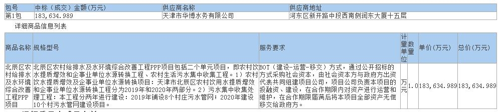 從天津市政府采購網(wǎng)獲悉,天津市華博水務有限公司預中標天津市北辰區(qū)農(nóng)村給排水及水環(huán)境綜合改善工程PPP項目。