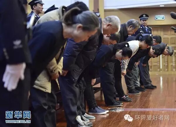11月9日,天津中濱海盛衛(wèi)生安全評價監(jiān)測有限公司11名直接責(zé)任人員在法庭上鞠躬謝罪。新華社記者 岳月偉 攝