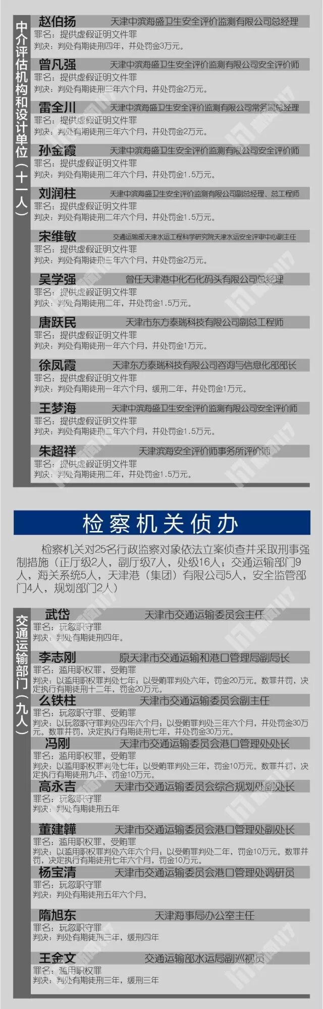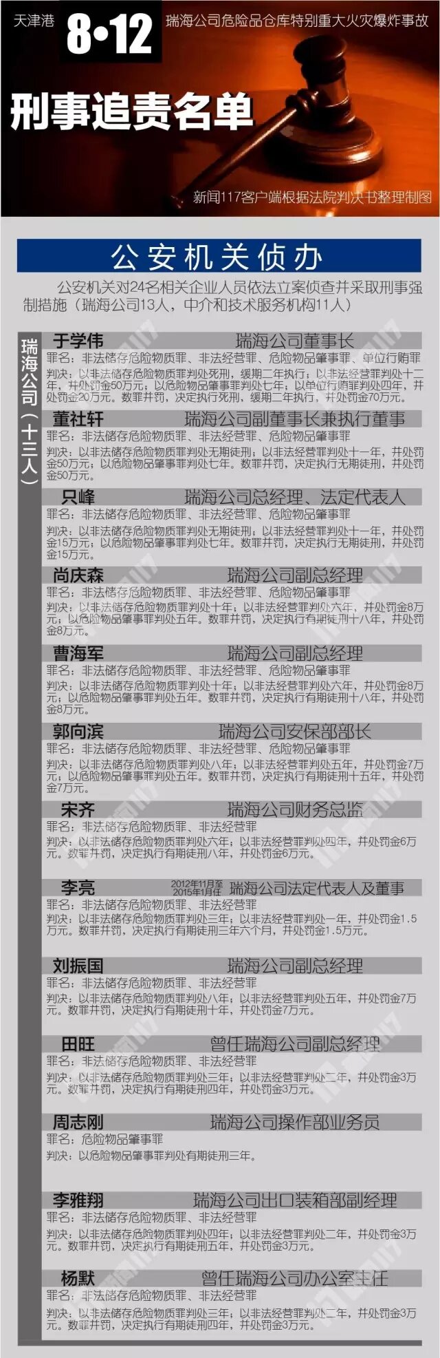 根據(jù)各被告人犯罪的事實、性質(zhì)、情節(jié)和造成的社會危害后果以及在共同犯罪中的地位、作用,法院依法作出一審判決。瑞海公司董事長于學(xué)偉構(gòu)成非法儲存危險物質(zhì)罪、非法經(jīng)營罪、危險物品肇事罪、行賄罪,予以數(shù)罪并罰,依法判處死刑緩期二年執(zhí)行,并處罰金人民幣70萬元;瑞海公司副董事長董社軒、總經(jīng)理只峰等5人構(gòu)成非法儲存危險物質(zhì)罪、非法經(jīng)營罪、危險物品肇事罪,分別被判處無期徒刑到十五年有期徒刑不等的刑罰;瑞海公司其他7名直接責(zé)任人員分別被判處十年到三年有期徒刑不等的刑罰。中濱安評公司犯提供虛假證明文件罪,依法判處罰金25萬元:中濱安評公司董事長、總經(jīng)理趙伯揚等11名直接責(zé)任人員分別被判處四年到一年六個月不等的有期徒刑。天津市交通運輸委員會主任武岱等25名國家機關(guān)工作人員分別被以玩忽職守罪或濫用職權(quán)罪判處三年到七年不等的有期徒刑,其中李志剛等8人同時犯受賄罪,予以數(shù)罪并罰。