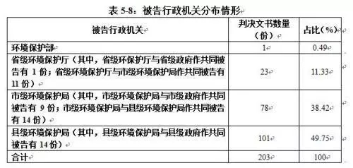 現(xiàn)實(shí)中,一些政府部門因環(huán)境問題被起訴的案例頻頻見諸報(bào)端。報(bào)告從環(huán)境行政裁判文書的結(jié)構(gòu)分析指出,從2016年全年203份判決文書來看,基層環(huán)保部門是主要的被告行政機(jī)關(guān)。
