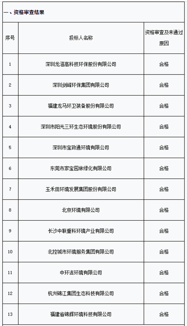 2020年1月15日,經(jīng)評審小組評定,寶安區(qū)新橋和沙井街道環(huán)衛(wèi)一體化PPP項目,共有13家企業(yè)通過資格審查。(見圖二)