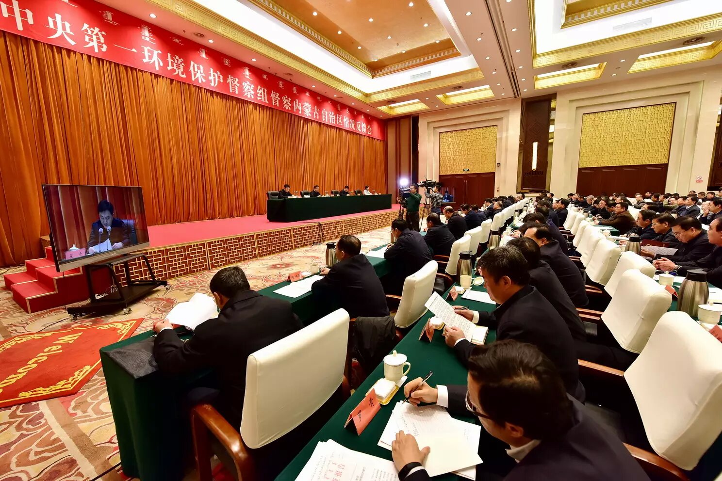 11月12日上午,中央第一環(huán)境保護督察組督察內(nèi)蒙古自治區(qū)情況反饋會現(xiàn)場。攝影/章軻