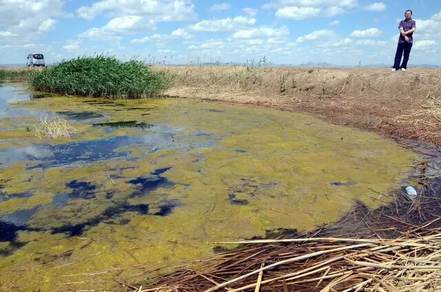 圖為《第一財經(jīng)日報》記者曾經(jīng)拍攝到的內(nèi)蒙古烏梁素海污染景象:水面大量黃苔滋生,意味著水體已受到嚴重污染。攝影/章軻