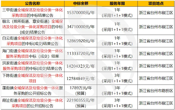 筆者對(duì)“全域保潔及垃圾分類(lèi)一體化采購(gòu)項(xiàng)目”印象較為深刻,故從E標(biāo)通對(duì)此類(lèi)項(xiàng)目進(jìn)行檢索。不完全統(tǒng)計(jì),此類(lèi)“全域保潔及垃圾分類(lèi)一體化采購(gòu)項(xiàng)目”主要集中在浙江省,年服務(wù)金額大多在1000萬(wàn)元-3000萬(wàn)元/年范圍內(nèi),合同簽訂模式主要采用1+1+1模式。