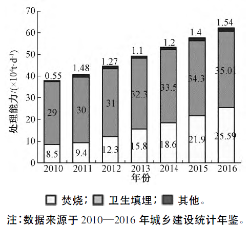 圖1 2010—2016中國(guó)生活垃圾處理能力由圖1可知:我國(guó)生活垃圾主要處理方式為填埋與焚燒,其中填埋仍占主要地位。填埋處理具有方法簡(jiǎn)單、技術(shù)門檻低的特點(diǎn),是我國(guó)長(zhǎng)期以來廣泛采用的處理方式,但填埋場(chǎng)占地大、使用年限短,不但可能影響地下水和土壤環(huán)境,還會(huì)造成大量有機(jī)質(zhì)的浪費(fèi),與可持續(xù)發(fā)展、綠色發(fā)展的理念相悖。與填埋不同,焚燒處理占地小、能極大程度地實(shí)現(xiàn)減量化,并產(chǎn)生電能,近年來發(fā)展迅猛。此外,其他處理方式(如堆肥等)處理能力也大幅提升。就發(fā)展趨勢(shì)來看,多元化方式或?qū)⒅鸩饺〈盥癯蔀橹鲗?dǎo)的處理模式。