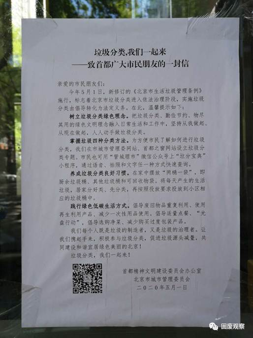 垃圾分類的宣傳和指導(dǎo)如何進(jìn)一步加強(qiáng)?藍(lán)藍(lán)天工作室記者觀察自己所在的小區(qū)發(fā)現(xiàn),設(shè)了分類垃圾桶,旁邊沒有專業(yè)指導(dǎo)人員,居民分不分類、分得對不對,基本全憑自覺。上海市剛推行垃圾分類的時(shí)候,經(jīng)常有志愿者站在垃圾桶旁問前來投放的居民“你是什么垃圾”。為啥北京很多小區(qū)目前沒人問這樣的問題?國務(wù)院發(fā)展研究中心資源與環(huán)境政策研究所副所長常紀(jì)文表示,從5月1日《條例》開始執(zhí)行后,他天天去附近小區(qū)拍照檢查??傮w看來垃圾分類已經(jīng)起步了,各小區(qū)基本都配備了廚余垃圾桶等,但仍然存在一些問題。例如,部分小區(qū)內(nèi)沒有宣傳橫幅,分類垃圾桶邊沒有配備專人進(jìn)行指導(dǎo)監(jiān)督。一些小區(qū)宣傳和指導(dǎo)不到位,導(dǎo)致居民有分類意識(shí),但缺乏分類知識(shí)。“我在不少小區(qū)看到大家把外賣餐盒跟廚余垃圾扔在一起,但它屬于使用過的、沾了菜湯油污的塑料類制品,應(yīng)該投放到其他垃圾桶中?!背<o(jì)文說。在有的小區(qū),為保證每個(gè)分類垃圾桶旁都有指導(dǎo)人員,取消了一些垃圾桶,讓居民走到較遠(yuǎn)的投放點(diǎn)扔垃圾。常紀(jì)文表示,他觀察到一些小區(qū)內(nèi)垃圾桶分布不均勻,有些樓棟下缺少廚余垃圾桶,有些沒有其他垃圾桶,“至少應(yīng)該以某種形式讓居民知曉,小區(qū)內(nèi)哪里有對應(yīng)的分類垃圾桶,方便精準(zhǔn)投放?!?/span>劉建國認(rèn)為,現(xiàn)階段,應(yīng)進(jìn)一步加大宣傳教育和組織動(dòng)員力度,讓垃圾分類真正“熱起來”;層層落實(shí)各級(jí)政府相關(guān)職能部門職責(zé),特別是切實(shí)落實(shí)管理責(zé)任人責(zé)任,將壓力和責(zé)任傳導(dǎo)到每個(gè)居民,讓垃圾分類“硬起來”;統(tǒng)籌疫情防控和垃圾分類兩項(xiàng)工作,讓二者有機(jī)結(jié)合,互相促進(jìn),讓垃圾分類“動(dòng)起來”;北京的黨政機(jī)關(guān)、高校科研院所、企業(yè)總部、社會(huì)組織密集,應(yīng)帶頭做好源頭減量和垃圾分類,為居民作出表率、增添信心,讓垃圾分類“亮起來”。“未來,要從執(zhí)法保障、政策激勵(lì)、長效機(jī)制、科學(xué)管理、多元共治、科技支撐等不同層面,不斷完善和優(yōu)化垃圾分類投放、收集、運(yùn)輸、處理全鏈條,倒逼生產(chǎn)生活環(huán)節(jié)源頭減量,分類物品物盡其用各得其所,降低垃圾分類的綜合社會(huì)成本,促進(jìn)居民養(yǎng)成良好習(xí)慣,提升社會(huì)文明水平?!眲⒔▏f。上圖:北京市有關(guān)部門致市民的一封信。(劉毅攝) 如何避免運(yùn)輸和處置中出現(xiàn)混裝混運(yùn)現(xiàn)象?不少居民表示,推行生活垃圾強(qiáng)制分類以來,自己所在的小區(qū),垃圾分類的宣傳力度明顯加強(qiáng),做到了分類投放、分類運(yùn)輸。然而,也有居民表示,自己辛辛苦苦分好類,甚至把快遞盒上的膠帶都刮下來按類別投放,結(jié)果發(fā)現(xiàn)垃圾車還是把所有垃圾一股腦混倒在一起運(yùn)走。劉建國表示,“前端分類,后端混合”是個(gè)廣受詬病的老問題,實(shí)際上是垃圾分類系統(tǒng)前后端不配套造成的?!侗本┦猩罾芾?xiàng)l例》中約束的一個(gè)主要對象,是從事垃圾收集運(yùn)輸處理的企業(yè),處罰門檻很低,處罰力度很大,就是為了解決先分后混、混裝混運(yùn)的問題。“居民看到混裝混運(yùn)現(xiàn)象,可以馬上投訴,督促企業(yè)做好分類收集運(yùn)輸處理。當(dāng)然,咱們自己也要做好分類投放,不能以混裝混運(yùn)為借口而不履行義務(wù)。只有大家各負(fù)其責(zé),才能徹底杜絕混裝混運(yùn)現(xiàn)象?!眲⒔▏f。常紀(jì)文認(rèn)為,前端后端匹配才符合垃圾分類的目的。對此需要標(biāo)本兼治:治本,需建設(shè)相匹配的廚余垃圾處置設(shè)施以及干垃圾的焚燒或填埋設(shè)施。治標(biāo),應(yīng)采取嚴(yán)格的處罰措施,沒有處罰,小區(qū)物業(yè)和環(huán)衛(wèi)部門往往會(huì)存有僥幸心理,使垃圾分類工作停滯不前;只有嚴(yán)格執(zhí)行懲處措施,才能對垃圾分類執(zhí)行方起到震懾作用,后端的各個(gè)環(huán)節(jié)才能順暢配合。為更好解決后端混運(yùn)問題,常紀(jì)文還建議,改良垃圾運(yùn)輸車輛?!皻W洲有許多垃圾分類車輛是能同時(shí)運(yùn)輸兩種垃圾的,我們也可以在設(shè)計(jì)方面做些改動(dòng),在車輛內(nèi)部進(jìn)行分隔,讓一輛車既可以運(yùn)廚余垃圾也可以運(yùn)其他垃圾,降低成本的同時(shí),方便操作?!?/span>劉建國認(rèn)為,疫情防控與垃圾分類這兩件事并不沖突?,F(xiàn)在疫情防控已經(jīng)進(jìn)入到常態(tài)化階段,可以把疫情防控中形成的好經(jīng)驗(yàn)好做法好機(jī)制,如社區(qū)精細(xì)化管理、居民的規(guī)則意識(shí)和衛(wèi)生習(xí)慣、鄰里之間互相幫助互相監(jiān)督等,順勢轉(zhuǎn)化為垃圾分類的推動(dòng)力。來源 | 人民日報(bào)中央廚房·藍(lán)藍(lán)天工作室