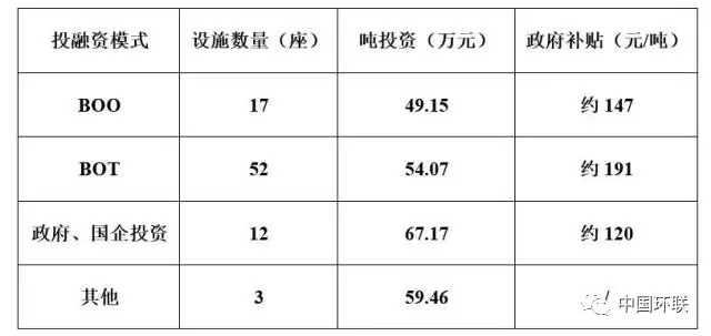 不同投融資模式餐廚垃圾處理設(shè)施的建設(shè)數(shù)量及噸投資情況