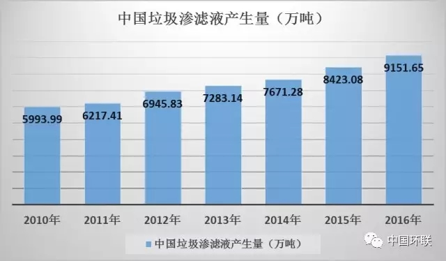 根據(jù)前瞻產(chǎn)業(yè)研究院發(fā)布的報告, 2016年,國內(nèi)垃圾滲濾液產(chǎn)生量約為9152萬噸,日均產(chǎn)生量約為25萬噸。