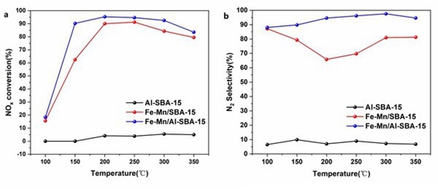 圖3. Fe-Mn/SBA-15催化劑和Fe-Mn/Al-SBA-15催化劑的NH3-SCR脫硝活性結果. a NOx轉化率.b N2選擇性