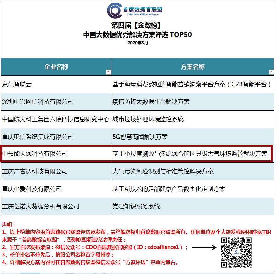 近日,由首席數(shù)據(jù)官聯(lián)盟發(fā)起的第四屆【金數(shù)榜】中國大數(shù)據(jù)優(yōu)秀解決方案及案例TOP50評選活動正式公布評選結果,中節(jié)能天融科技有限公司(以下簡稱“天融科技”)憑借“基于小尺度溯源與多源融合的區(qū)縣級大氣環(huán)境監(jiān)管解決方案”入選中國大數(shù)據(jù)優(yōu)秀解決方案TOP50。