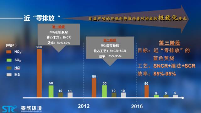 第一個階段,在2012年之前,我們比較傳統(tǒng)的處理工藝是SNCR,NOX初級脫除效率是50%-60%;第二個階段,2012年以后,由于引用了SCR,排放標(biāo)準(zhǔn)得到進(jìn)一步的降低,NOX深度脫除效率達(dá)75%-95%;第三個階段,到2016年,國家環(huán)保管理總體收緊,煙氣的排放標(biāo)準(zhǔn)越來越嚴(yán),要求近“零排放”的藍(lán)色焚燒。對于我們來說,就需要將工藝做進(jìn)一步改進(jìn)。我們判斷,低溫的SCR處理和濕法處理工藝的價值會凸顯出來。