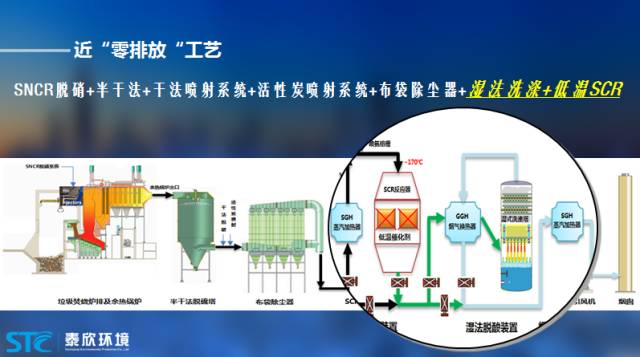 前面一段基本上是標(biāo)準(zhǔn)的半干法工藝,后面添加了一些新的東西。一個是SCR,降低氮氧化物,在SCR的入口有一個SGH蒸汽加熱器,主要是為了達(dá)到除塵器的溫度要求,大概能提高30度-50度左右。SCR的出口連接濕法處理設(shè)備,進(jìn)一步脫硫脫塵。
