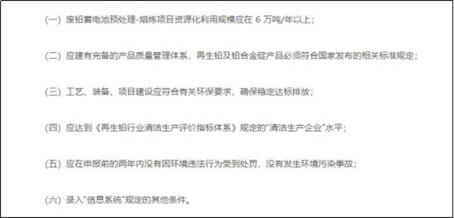 關(guān)于蓄電池的資源利用,《征求意見稿》提出了園區(qū)化管理和企業(yè)管理兩種。其中規(guī)定廢鉛蓄電池資源化利用項目應位于功能定位相符、環(huán)保基礎設施齊全的產(chǎn)業(yè)園區(qū)內(nèi);各地市應提出轄區(qū)內(nèi)符合條件的規(guī)范資源化利用企業(yè),經(jīng)行業(yè)評議、部委合議后錄入“信息系統(tǒng)”,具體條件如下: