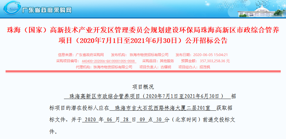 按照開標計劃,6月28日,采購預(yù)算高達357,303,258.36元/年的珠海高新區(qū)市政綜合管養(yǎng)項目將公布中標結(jié)果。