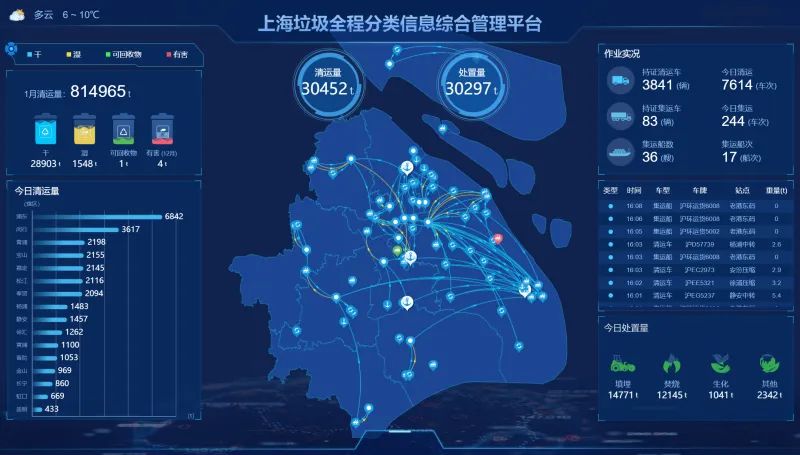 該平臺自2018年底建成投用,用真實數(shù)據(jù)實時繪制申城垃圾物流走向圖,實現(xiàn)數(shù)字化、可視化監(jiān)控,賦予生活垃圾“數(shù)字生命”。具體來說,垃圾產(chǎn)生的時間,從哪個轄區(qū)來的,哪輛車清運的,裝進了哪個集裝箱,運到哪里處置,全部一清二楚。目前,該平臺已接入全市16個區(qū)的生活垃圾數(shù)據(jù),大大提升了分類實效。在智能化監(jiān)管之前,干濕垃圾比例是在9比1,現(xiàn)在已經(jīng)“逆襲”到6比4左右,這恰恰說明更多濕垃圾從干垃圾里分出來了,分類精度大幅躍升。