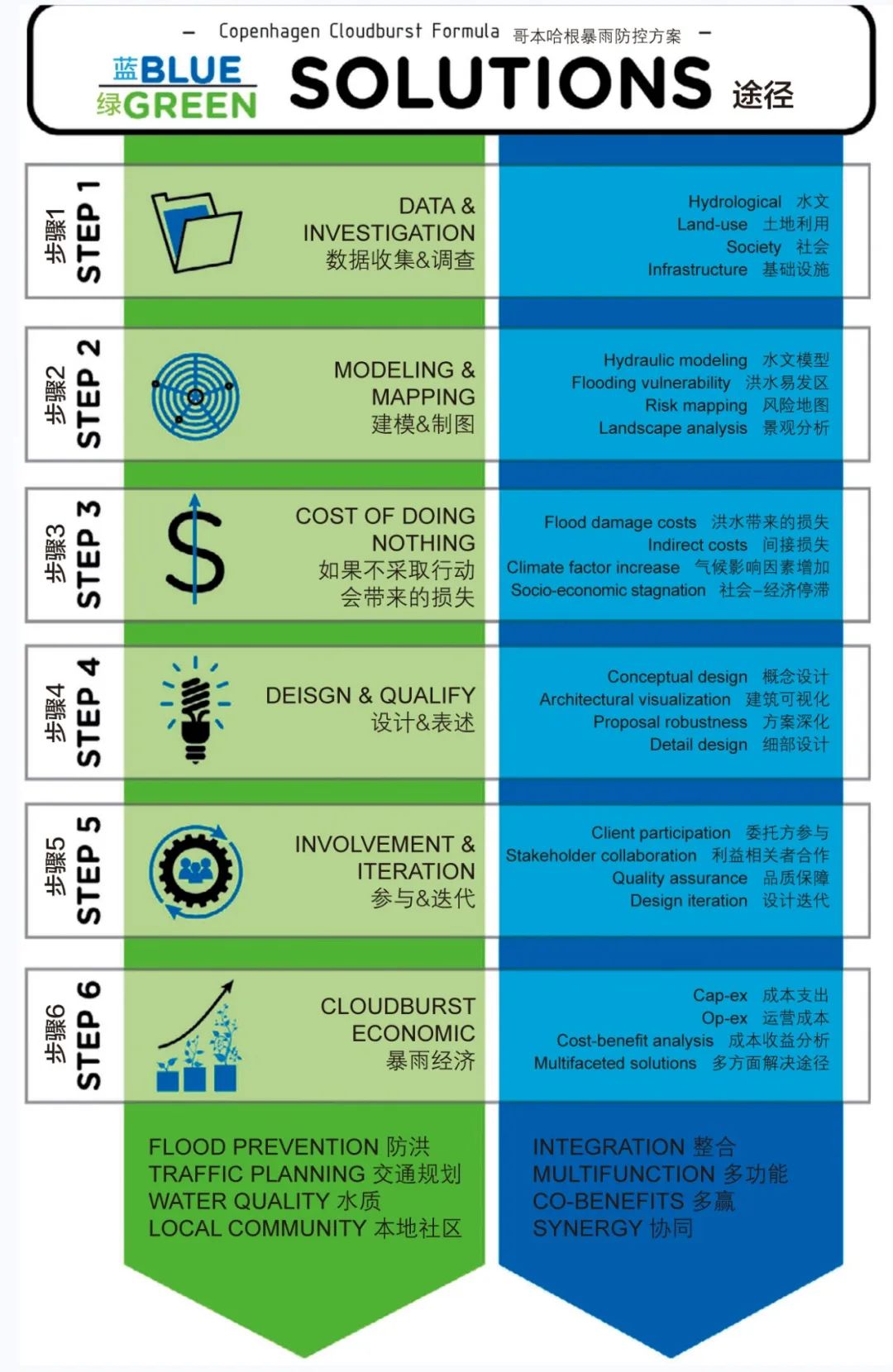 與極端天氣的對(duì)抗猶如一場(chǎng)戰(zhàn)爭(zhēng)。但我們必須在開(kāi)戰(zhàn)前構(gòu)想愿景,并做出合理的作戰(zhàn)計(jì)劃。在編著于公元前5世紀(jì)的中國(guó)古代軍事寶典《孫子兵法》中,作者就強(qiáng)調(diào)了制定目標(biāo)與計(jì)劃對(duì)成功的重要意義(原文為:夫未戰(zhàn)而廟算勝者,得算多也)。這樣的道理同樣也適用于當(dāng)今城市與暴雨之間的戰(zhàn)爭(zhēng)。我們的目標(biāo)非常明確——我們希望城市是宜居的,同時(shí)可以緩解氣候變化的影響。而若沒(méi)有周密合理的計(jì)劃,即使投入數(shù)億的資金,我們也只會(huì)輸?shù)暨@場(chǎng)戰(zhàn)爭(zhēng)。