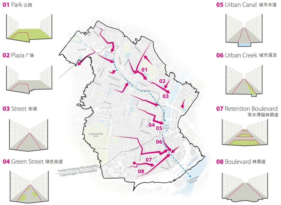 整合后的規(guī)劃將為城市帶來(lái)諸多額外效益。隨著對(duì)總體規(guī)劃愿景的細(xì)化,哥本哈根城區(qū)被分為8個(gè)區(qū)域,每個(gè)區(qū)域作為一個(gè)獨(dú)立的集水區(qū),均需要更為細(xì)致的具體規(guī)劃方案。安博負(fù)責(zé)其中4個(gè)區(qū)域的具體實(shí)施方案設(shè)計(jì),其中包括暴雨街道、雨水滯留街道、綠色街道的具體設(shè)計(jì),及如何通過(guò)這些方案實(shí)現(xiàn)提升城市宜居性的總體目標(biāo)。