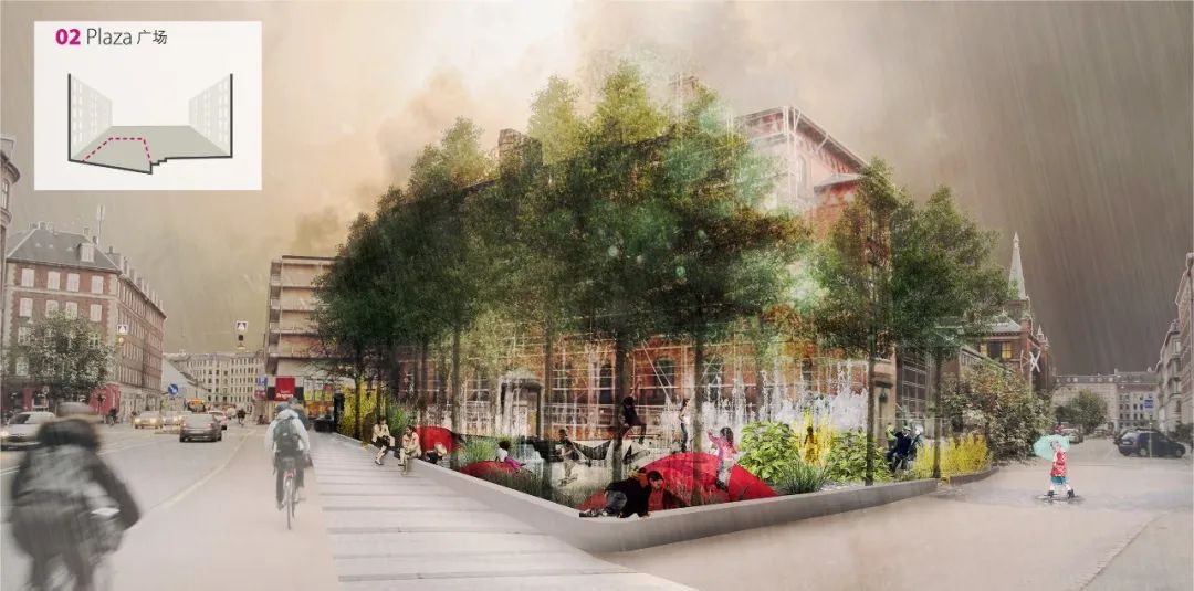 哥本哈根市中心的圣安妮廣場(chǎng)是暴雨防控詳細(xì)規(guī)劃中的首個(gè)建成項(xiàng)目。廣場(chǎng)毗鄰女王的宮殿,距著名的美人魚(yú)銅像不遠(yuǎn)。該區(qū)域曾是特大暴雨事件中受災(zāi)最嚴(yán)重的區(qū)域之一,而如今已轉(zhuǎn)變?yōu)橐蛔晁疁艄珗@。