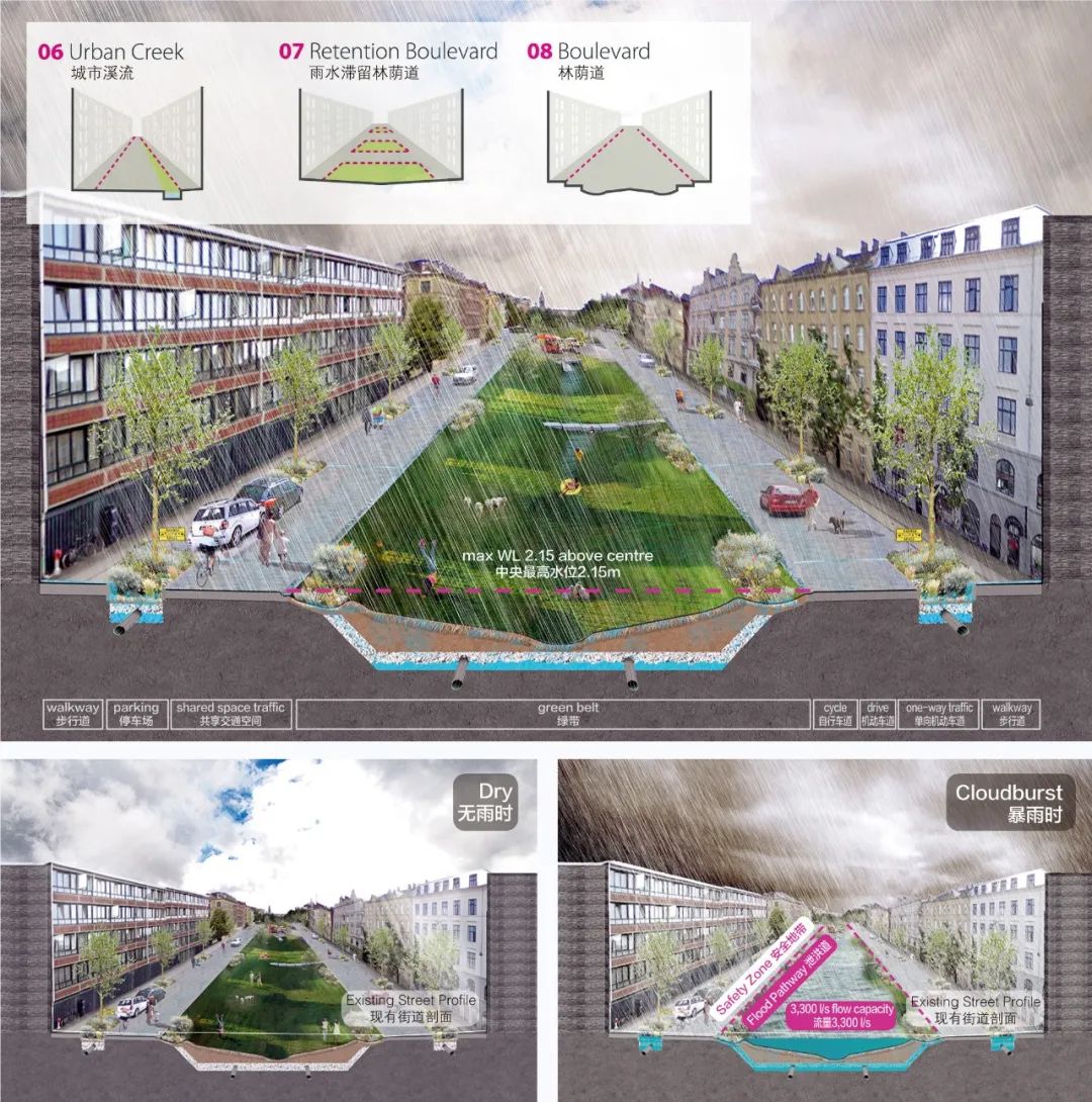 另一個(gè)強(qiáng)有力的海綿城市具體策略是林蔭道,這種尺度足夠?qū)挼慕值烙兄萘烤薮蟮挠晁疁艨臻g,同時(shí)可以轉(zhuǎn)移大量雨洪徑流。索恩德林蔭道是一條有著中央綠帶的寬闊大道。盡管這條綠帶為城市增添了綠意,但由于該區(qū)域地勢(shì)微高,且由中間向兩側(cè)的建筑傾斜,因而增加了道路兩旁建筑物的洪澇隱患。
