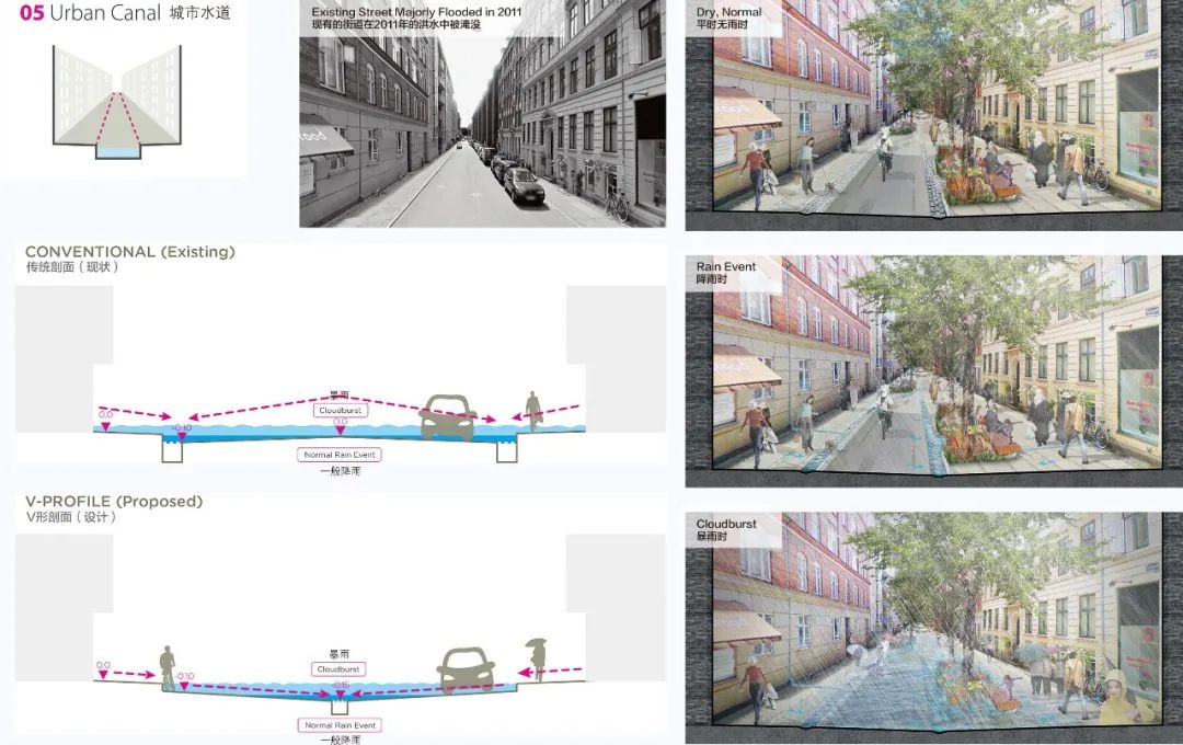 我們的具體策略之一是雨水滯留公園,這是我們的海綿城市“暴雨防控方案”中的一個(gè)關(guān)鍵要素。眾所周知,景色怡人的“藍(lán)綠公園”能夠?yàn)榫用窠】祹?lái)巨大裨益,而經(jīng)過(guò)設(shè)計(jì),這些公園也可以成為吸納特大洪水的“海綿”。該規(guī)劃充分利用哥本哈根市區(qū)三大內(nèi)湖之一的圣約爾根湖,通過(guò)將湖水水位由5.8m降低到2.8m,使其成為一座風(fēng)景秀美的湖濱公園。在提升城市休閑娛樂(lè)價(jià)值的同時(shí),海綿城市設(shè)計(jì)也為城市創(chuàng)造出一大片雨水集蓄區(qū)。而傳統(tǒng)的工程設(shè)計(jì)方式則只能通過(guò)建造巨型的、造價(jià)高昂的泄洪道或管網(wǎng)來(lái)傳輸雨水——而鑒于大型暴雨事件十分罕見(jiàn),這些設(shè)施在絕大多數(shù)情況下都將處于閑置狀態(tài)。與埋設(shè)地下雨洪排水管的工程造價(jià)相比,建造于地上的圣約爾根湖方案將節(jié)省大約10億元人民幣。通過(guò)這一看似簡(jiǎn)單的景觀設(shè)計(jì)策略,安博實(shí)現(xiàn)了以遠(yuǎn)低于傳統(tǒng)水泥蓄水池的成本來(lái)建造巨型蓄水設(shè)施的目標(biāo)。更為重要的是,人們可以走進(jìn)我們新建的藍(lán)綠公園,享受閑暇與歡愉。