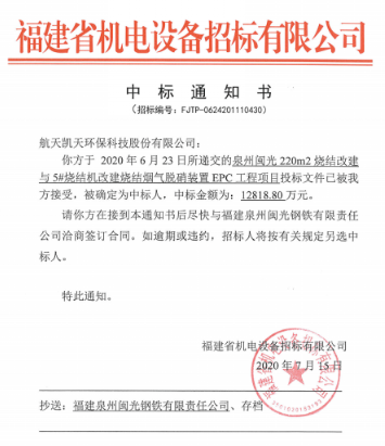 在6月到7月間,連續(xù)中標(biāo)甘肅通渭縣生活垃圾處理系統(tǒng)設(shè)備采購項(xiàng)目、金鼎重工有限公司1#燒結(jié)機(jī)濕式電除塵器項(xiàng)目、金鼎重工有限公司白灰窯煙氣脫硝項(xiàng)目、福建三鋼閩光股份有限公司動(dòng)力廠278th鍋爐煙氣增加SCR脫硝裝置及煙道換熱設(shè)備改造工程項(xiàng)目、泉州閩光220m²燒結(jié)改建與5#燒結(jié)機(jī)改建燒結(jié)煙氣脫硝裝置EPC工程項(xiàng)目、安陽市新普鋼鐵有限公司固定床脫硫脫硝改造SDS+布袋除塵燃煤氣鍋爐爐內(nèi)SCR脫硝改造環(huán)保升級(jí)項(xiàng)目等6個(gè)項(xiàng)目,合計(jì)中標(biāo)額1.95548億元,其中泉州閩光220m²燒結(jié)改建與5#燒結(jié)機(jī)改建燒結(jié)煙氣脫硝裝置EPC工程,中標(biāo)金額12818.8萬元,刷新了航天凱天環(huán)保大氣環(huán)境治理業(yè)務(wù)單個(gè)合同金額,也為企業(yè)在鋼鐵行業(yè)煙氣治理領(lǐng)域再樹典型業(yè)績(jī)。