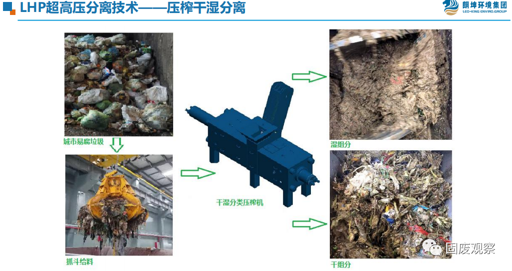 該項(xiàng)目設(shè)計(jì)規(guī)模是餐飲垃圾日處理400噸,廚余垃圾日處理600噸,糞污日處理1000噸,病死畜禽日處理40噸,合計(jì)設(shè)計(jì)規(guī)模2040噸,在近一年的實(shí)際運(yùn)營期間,隨著廣州市垃圾分類和疫情的情況,產(chǎn)能結(jié)構(gòu)發(fā)生變化。主要特點(diǎn)是:1、垃圾分類不斷推進(jìn),廚余垃圾實(shí)際處理量增大;2、廣州舊城改造推進(jìn),糞污實(shí)際清運(yùn)和處理量比設(shè)計(jì)小;在實(shí)際運(yùn)營中,其中餐飲垃圾目前處理量約500-600噸/天;廚余垃圾平均處理量約為1000噸/天,最高峰可達(dá)到近1200噸/日,占總處理量的一半以上。二、廣州項(xiàng)目的幾個(gè)亮點(diǎn)1. 朗坤環(huán)境集團(tuán)一直踐行如果對廚余垃圾去干榨凈,如何減少篩余物的含水率,提升篩余物的熱值?如何減少有機(jī)質(zhì)的流失?如何提升廚余垃圾的減量率?如何減少篩余物的外運(yùn)量?如何更好實(shí)現(xiàn)物質(zhì)的能源轉(zhuǎn)化?朗坤環(huán)境集團(tuán)研發(fā)的LHP超高壓分離技術(shù)真正對廚余垃圾做到了去干榨凈,通過在廣州項(xiàng)目一年多的應(yīng)用實(shí)踐,出渣易腐有機(jī)物比例達(dá)到了8-18%,預(yù)處理階段廚余垃圾整體減量達(dá)到了75-85%,僅有15-25%的篩余物外運(yùn)焚燒,實(shí)現(xiàn)了較高的減量率和有機(jī)質(zhì)提取率,工藝運(yùn)行穩(wěn)定、可靠,可以處理不破袋的廚余垃圾。