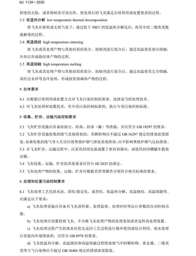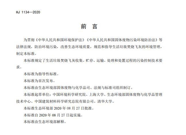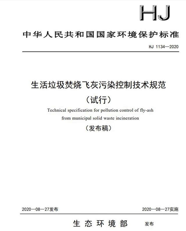 《生活垃圾焚燒飛灰污染控制技術(shù)規(guī)范(試行)》(HJ 1134-2020)