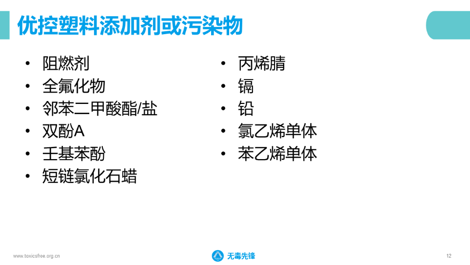 我們可以有一個抓手,抓重點。就是我們優(yōu)先關(guān)注這11種有毒塑料添加劑,同時這些有毒化學(xué)物質(zhì)最終還是會體現(xiàn)在產(chǎn)品當(dāng)中的,那也會有一個優(yōu)控產(chǎn)品名錄。當(dāng)我們進行產(chǎn)品去毒和控制管理時,也就相當(dāng)于把有毒的化學(xué)物質(zhì)進行控制。