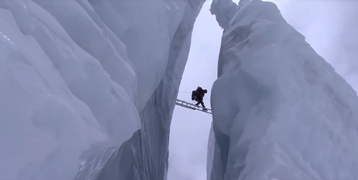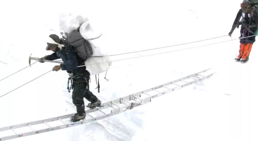納姆巴爾一行人為了撿拾垃圾,必須穿越隨時(shí)可能發(fā)生雪崩的冰川瀑布,用獨(dú)木梯通過兇險(xiǎn)的峽谷。