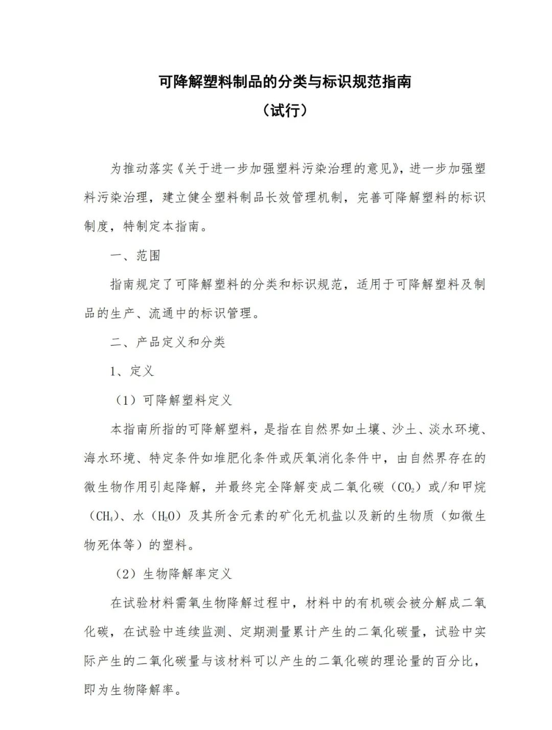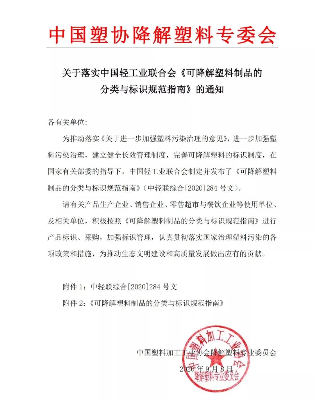 《倡議書(shū)》提出,將以可循環(huán)、易回收、可降解為導(dǎo)向,加大科技創(chuàng)新力度,研發(fā)性能達(dá)標(biāo)、綠色環(huán)保、經(jīng)濟(jì)適用的塑料材料與制品。同時(shí),加快相關(guān)標(biāo)準(zhǔn)研制,完善有關(guān)塑料再生利用標(biāo)準(zhǔn)體系,發(fā)布《可降解塑料的分類(lèi)與標(biāo)識(shí)要求指南》及再生塑料系列標(biāo)準(zhǔn),按照可降解塑料綠色設(shè)計(jì)評(píng)價(jià)標(biāo)準(zhǔn),開(kāi)展綠色設(shè)計(jì)產(chǎn)品評(píng)價(jià)認(rèn)定,為建立規(guī)范回收和循環(huán)利用的產(chǎn)業(yè)體系提供技術(shù)支撐。9月8日,中國(guó)輕工業(yè)聯(lián)合會(huì)發(fā)布《可降解塑料的分類(lèi)與標(biāo)識(shí)要求指南》通知,通知如下: