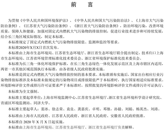 為貫徹落實(shí)《長江三角洲區(qū)域一體化發(fā)展規(guī)劃綱要》,推進(jìn)長三角生態(tài)綠色一體化發(fā)展示范區(qū)標(biāo)準(zhǔn)統(tǒng)一工作,上海市生態(tài)環(huán)境局、江蘇省生態(tài)環(huán)境廳、浙江省生態(tài)環(huán)境廳共同組織起草了固定式內(nèi)燃機(jī)大氣污染物排放標(biāo)準(zhǔn)(征求意見稿)。
