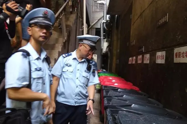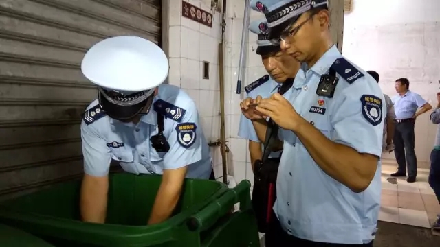 執(zhí)法人員仔細(xì)查看垃圾桶