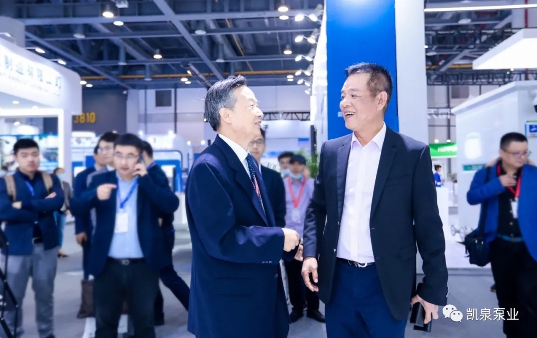 圖:國務(wù)院參事、中國城市科學(xué)研究會理事長、住建部原副部長、國際水協(xié)中國委員會主席仇保興與上海凱泉董事長兼總裁林凱文進行交流