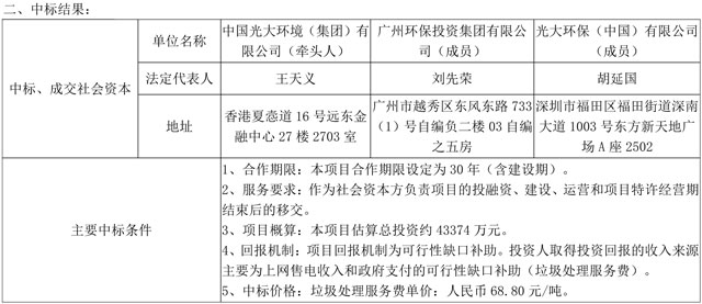 原標題:68.80元/噸!光大環(huán)境中標湖南邵東市生活垃圾焚燒發(fā)電PPP項目