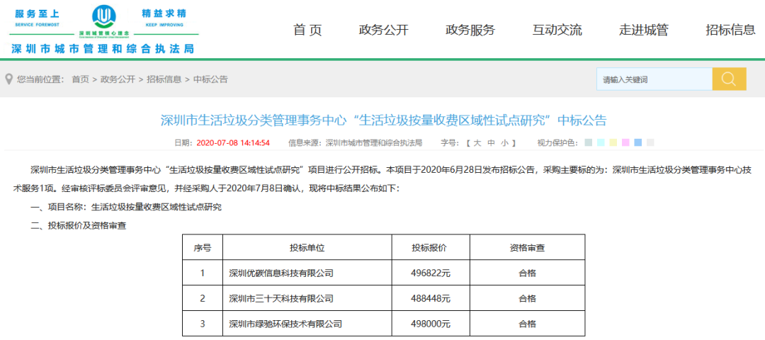 7月8日,深圳市生活垃圾分類管理事務(wù)中心“生活垃圾按量收費區(qū)域性試點研究項目”開標,服務(wù)期限:2020年7月10日-2020年12月10日。